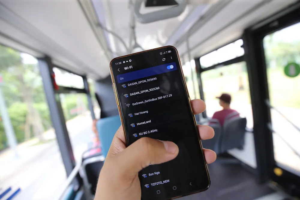 Một người dân đang thử dùng wifi miễn phí trên buýt điện. “Không yếu như tôi nghĩ, có thể lướt đọc báo, xem tiktok thoải mái dù nhiều người dùng một lúc”, anh cho biết.