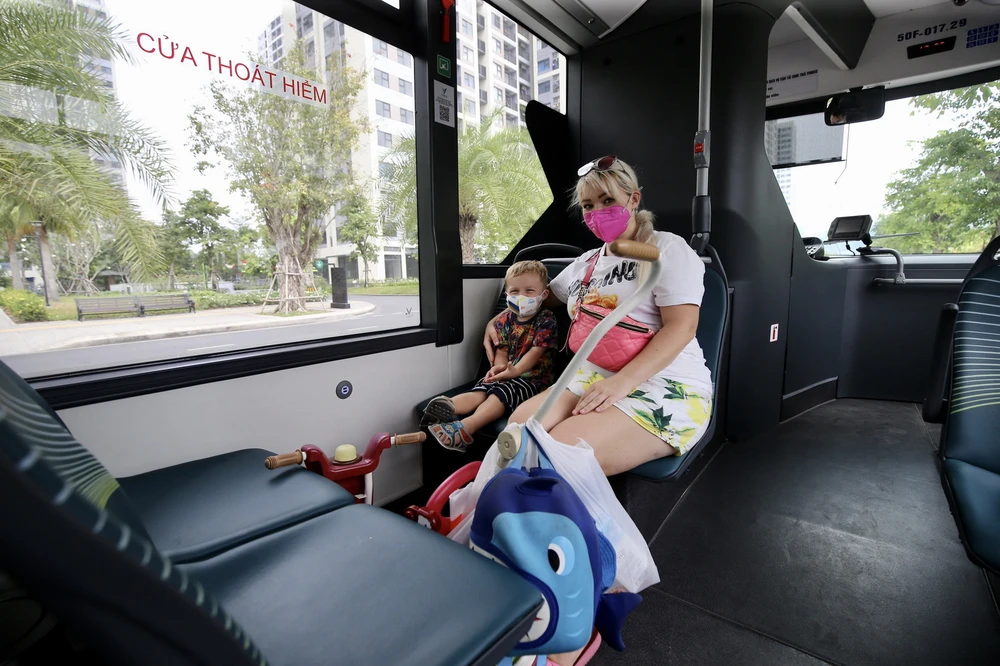 Hai mẹ con người Đức đang sinh sống tại Vinhomes Grand Park cũng rất thích thú với loại hình xe buýt điện mới.