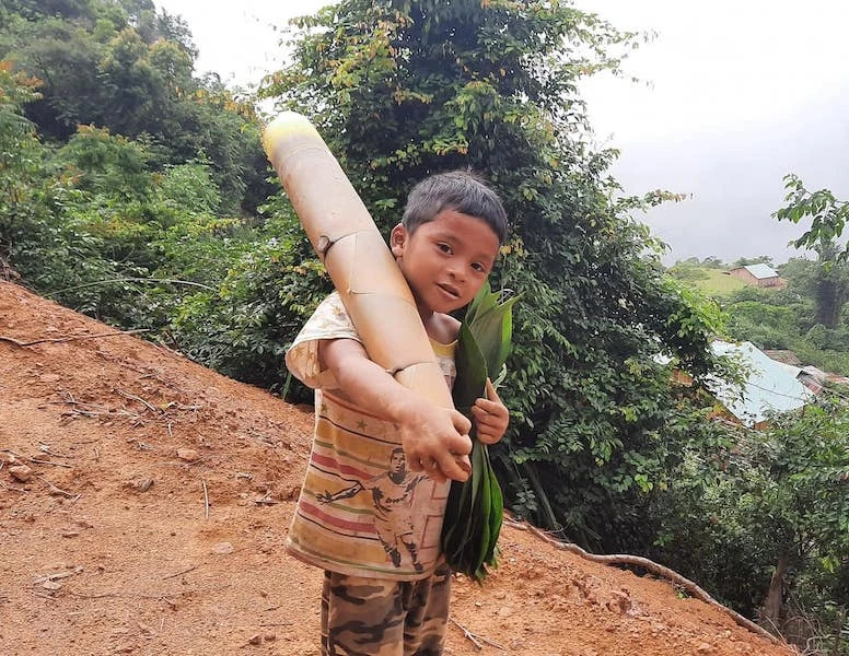 Một em nhỏ vác măng rừng ủng hộ, gửi về miền xuôi.