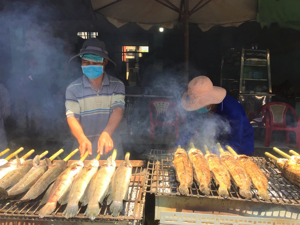 Nhân viên đang nướng cá lóc tại một tiệm ngay đầu đường Tân Kỳ Tân Quý cho biết, từ sáng đến giờ bán được khoảng 150 con, cả ngày mùng 9 năm ngoái bán được 300-400 con.