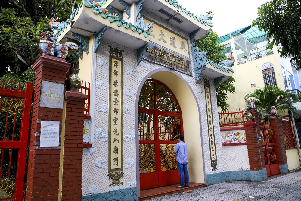 Người dân tưởng nhớ Đức Thánh Trần Hưng Đạo trước cổng đền đường Võ Thị Sáu, phường Tân Định, quận 1, TP.HCM. Ảnh: NGUYỆT NHI