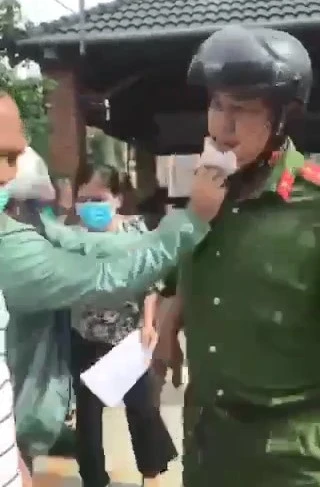 Người dân búc xúc đã lột khẩu trang của một cán bộ công an. Ảnh: Cắt từ clip