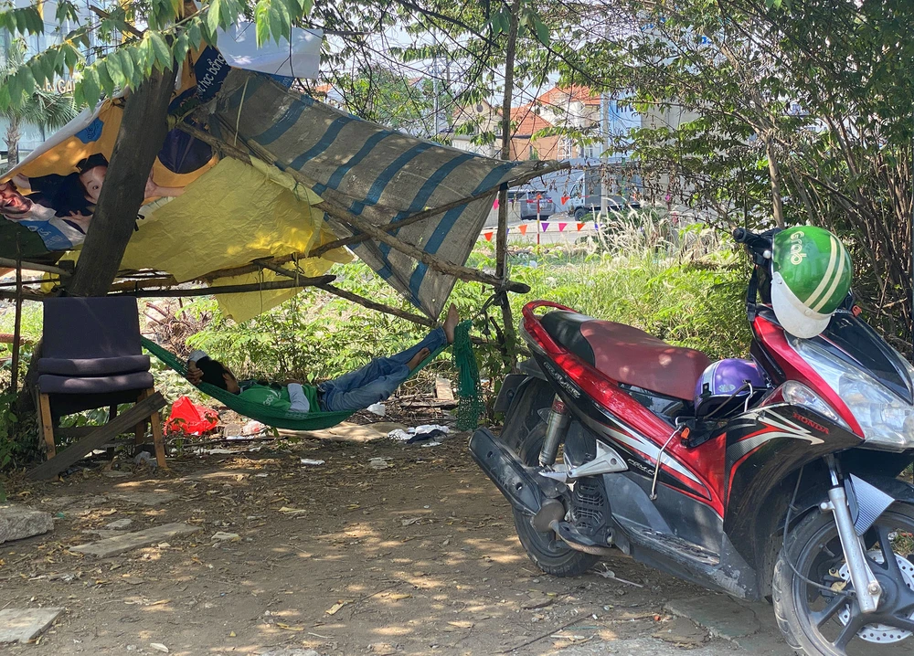 Một tài xế chạy xe ôm công nghệ dừng nghỉ trưa bên đường xa lộ Hà Nội.
