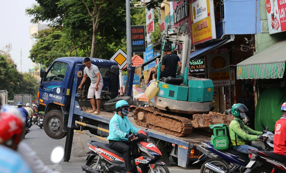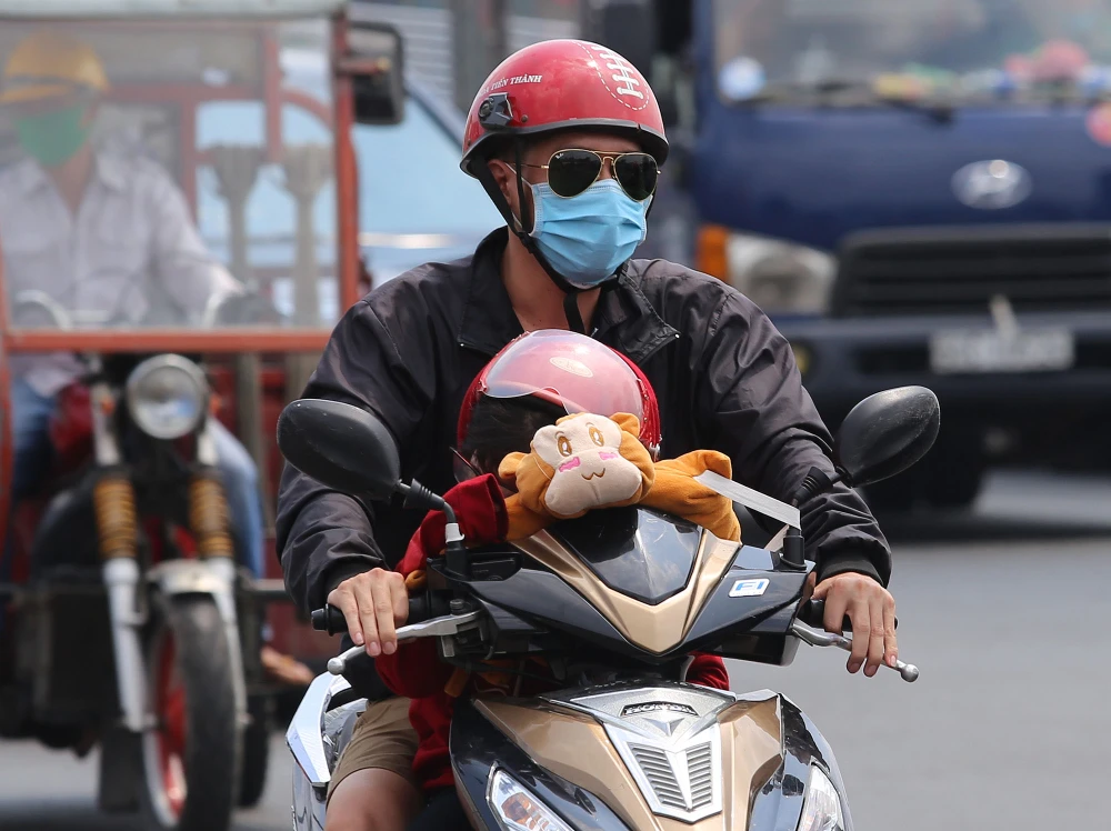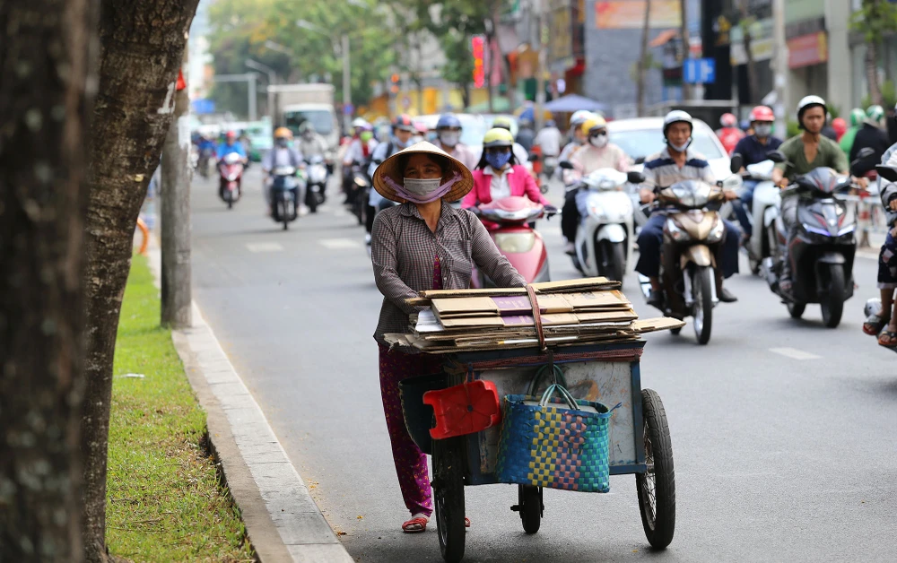 Người lao động khổ sở di chuyển dưới cái nóng oi bức của Sài Gòn.