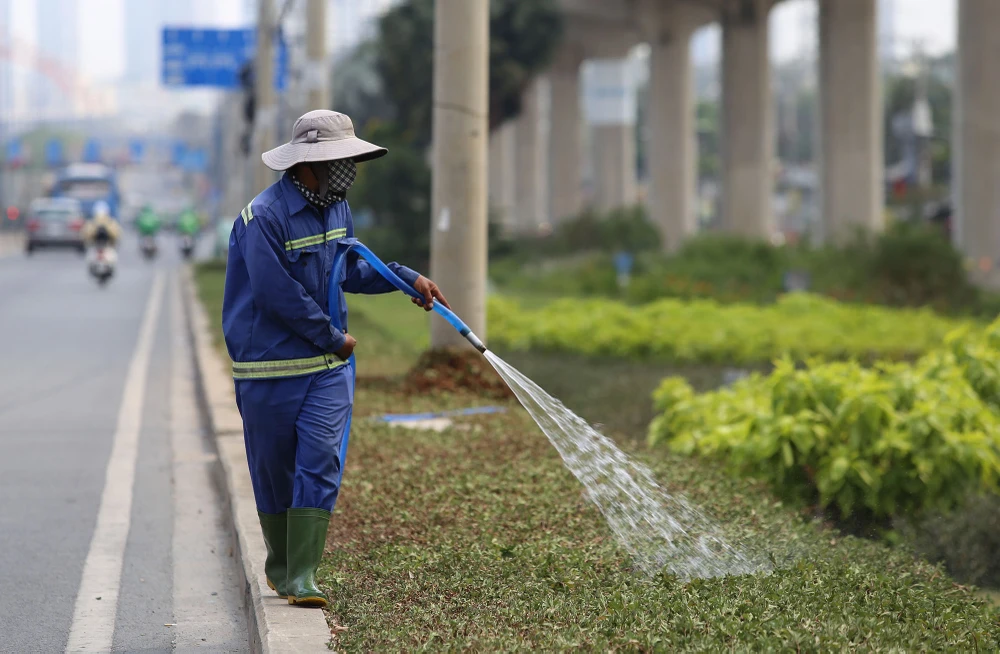 Công nhân vất vả tưới cây giữa trời nắng trên xa lộ Hà Nội.