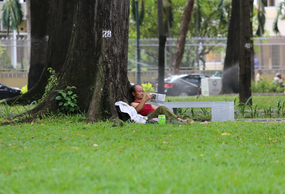 Người đàn ông ngồi dưới gốc cây trong Công viên 30-4 (quận 1) để tránh nóng.