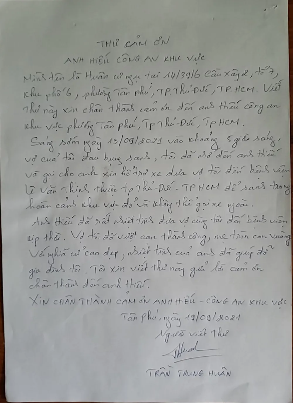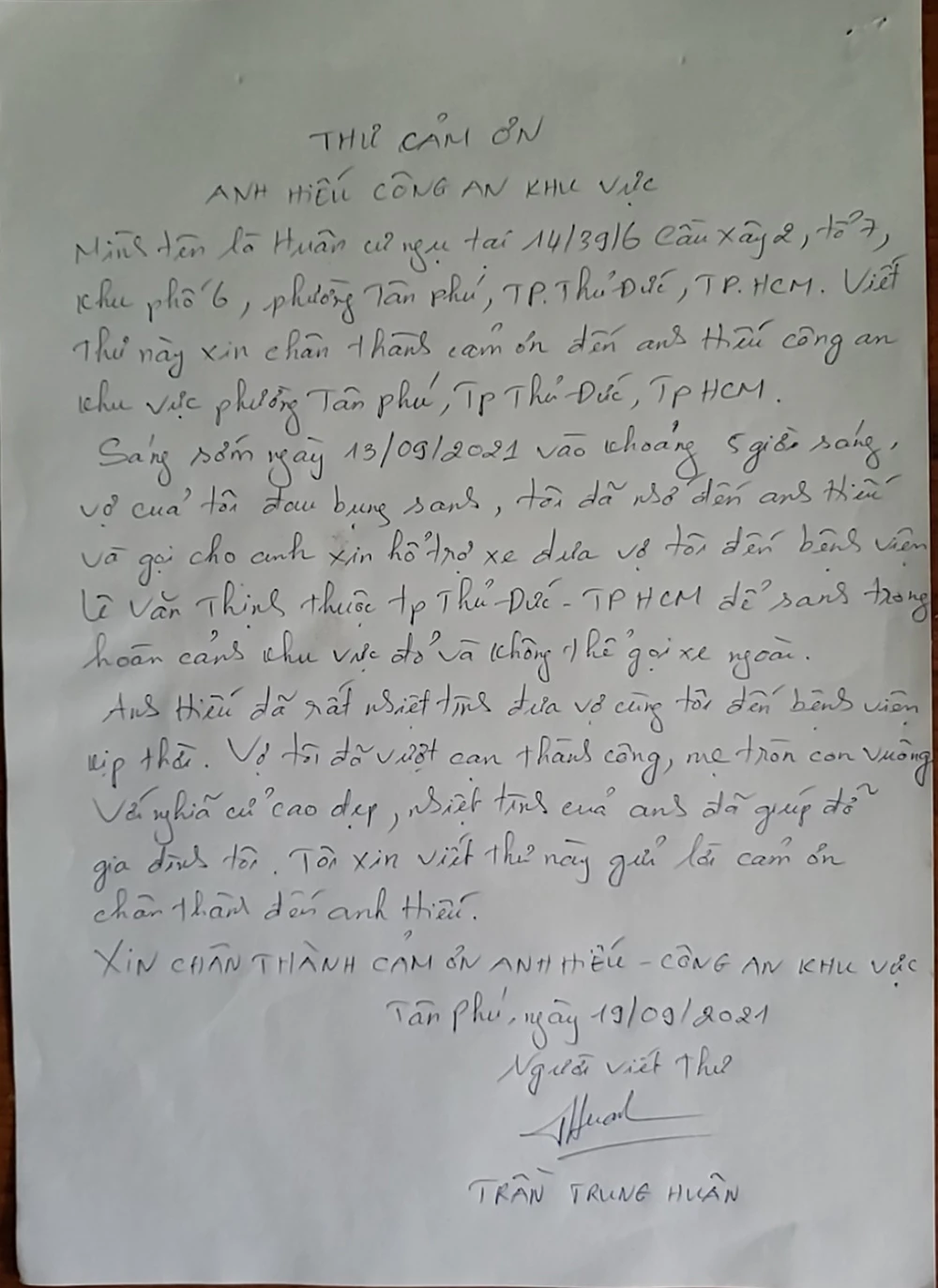 Ngày 24-9, Công an TP.HCM cho biết, Công an phường Tân Phú (TP Thủ Đức, TP.HCM) vừa nhận được lá thư cảm ơn của anh Trần Trung Huân (ngụ Khu phố 6, phường Tân Phú).