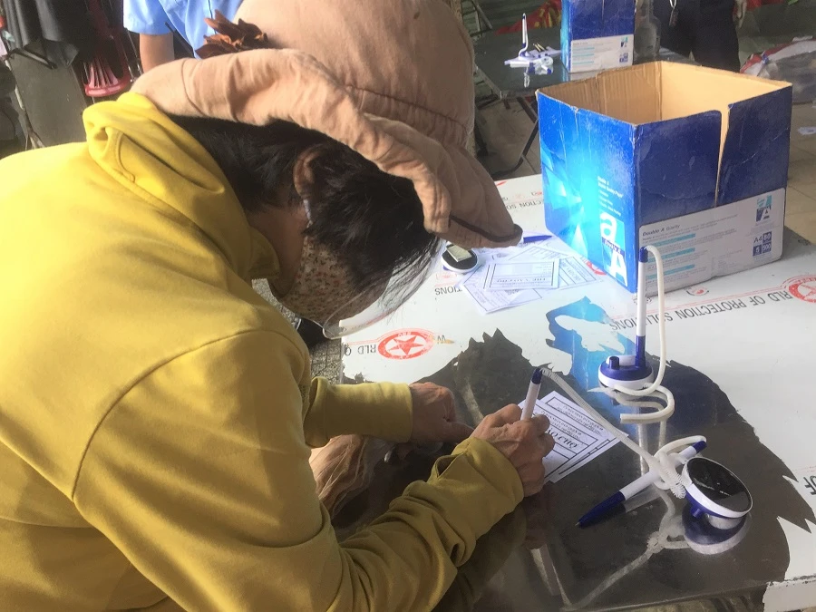 Người dân điền thông tin cá nhân vào thẻ đi chợ để vào chợ Nguyễn Tri Phương