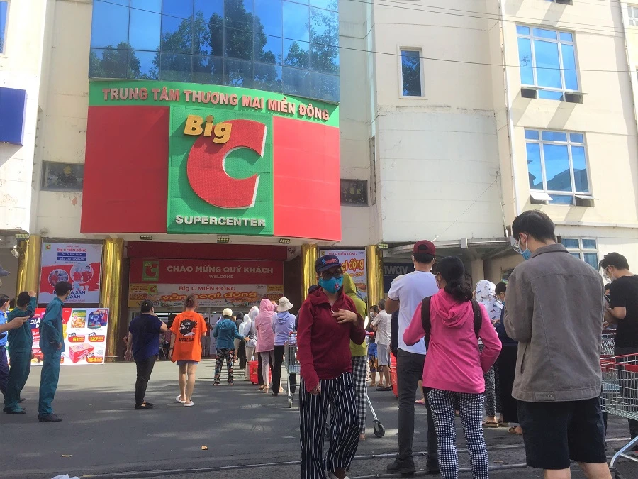 Người dân xếp hàng dài trước cổng chính siêu thị Big C Miền Đông