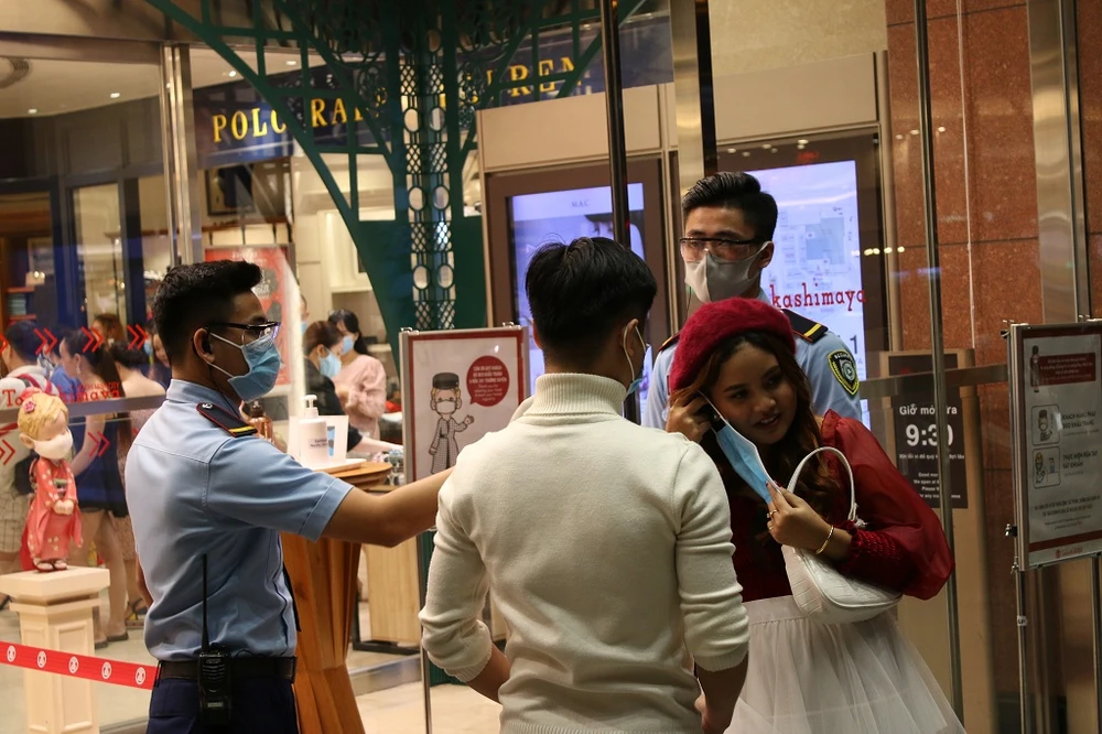 Bảo vệ trung tâm thương mại Takashimaya (Q.1, TP.HCM) tiến hành đo thân nhiệt và nhắc nhở người dân đeo khẩu trang khi ra vào mua sắm. Ảnh: DANH NGUYỄN.