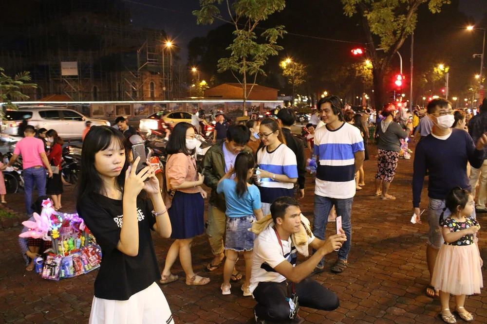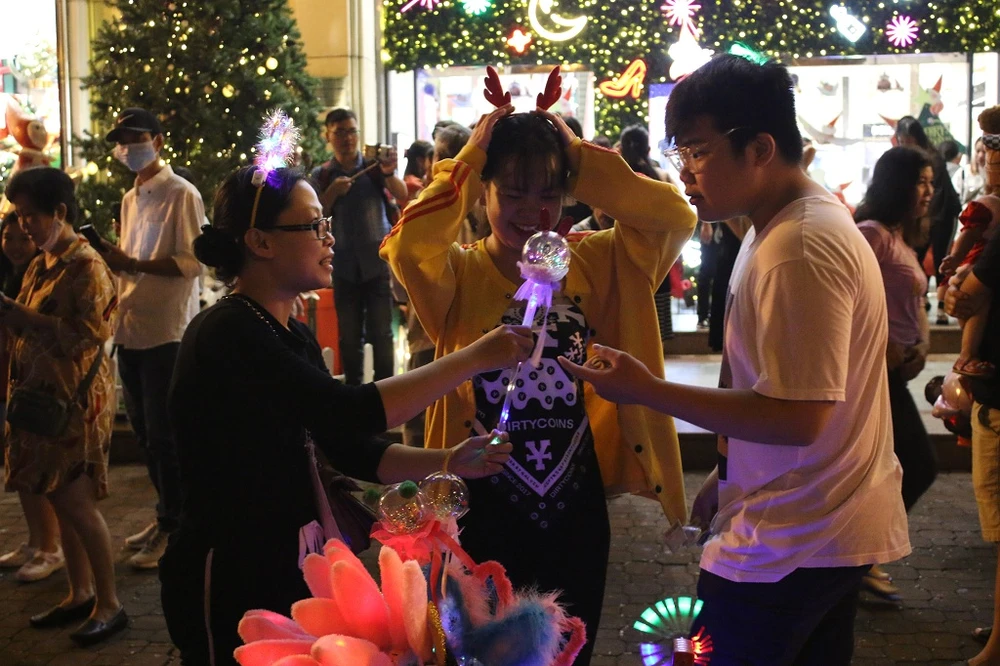 Các trung tâm thương mại tại trung tâm TP.HCM như Diamond Plaza, Takashimaya,... được trang trí đặc sắc, lộng lẫy, thu hút rất đông người đến vui chơi, chụp hình tạo kỷ niệm. Mặc dù dịch COVID-19 diễn biến phức tạp, nhưng một một số người dân đến tham quan, vui chơi đều không đeo khẩu trang.