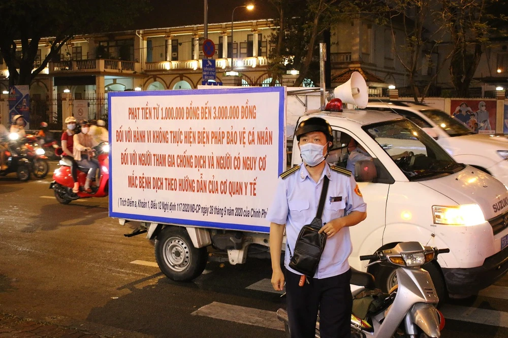 Để phòng chống dịch COVID-19, lực lượng chức năng Q.1, TP.HCM đã chạy xe kèm loa phát thanh kêu gọi người dân đeo khẩu trang và tránh tập trung đông đúc. Đồng thời đi đến nhắc nhở từng người đeo khẩu trang. Ảnh: DANH NGUYỄN.