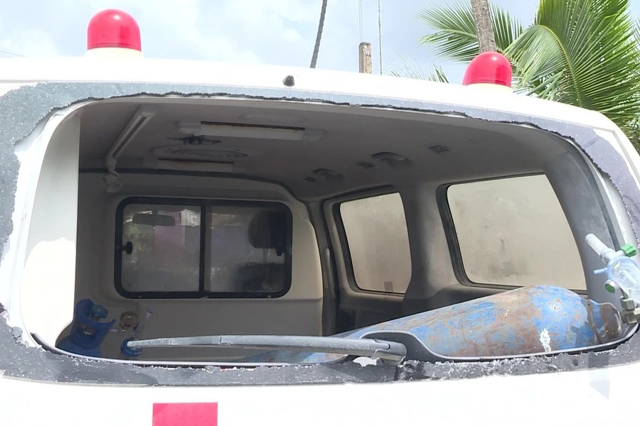 Cửa kính sau của xe cứu thương bị ông T. đập vỡ (ảnh: QUỐC VŨ).