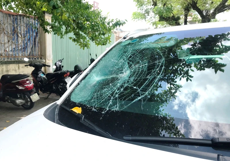 Ô tô bị đập vỡ kính. Ảnh: HẢI HIẾU