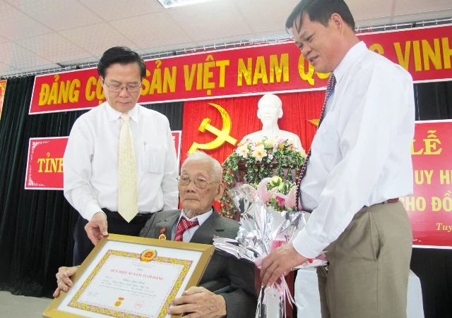 Lãnh đạo Tỉnh ủy Phú Yên trao huy hiệu 85 năm tuổi đảng và tặng hoa chúc mừng đảng viên lão thành Phan Ngọc Bích. Ảnh: TẤN LỘC