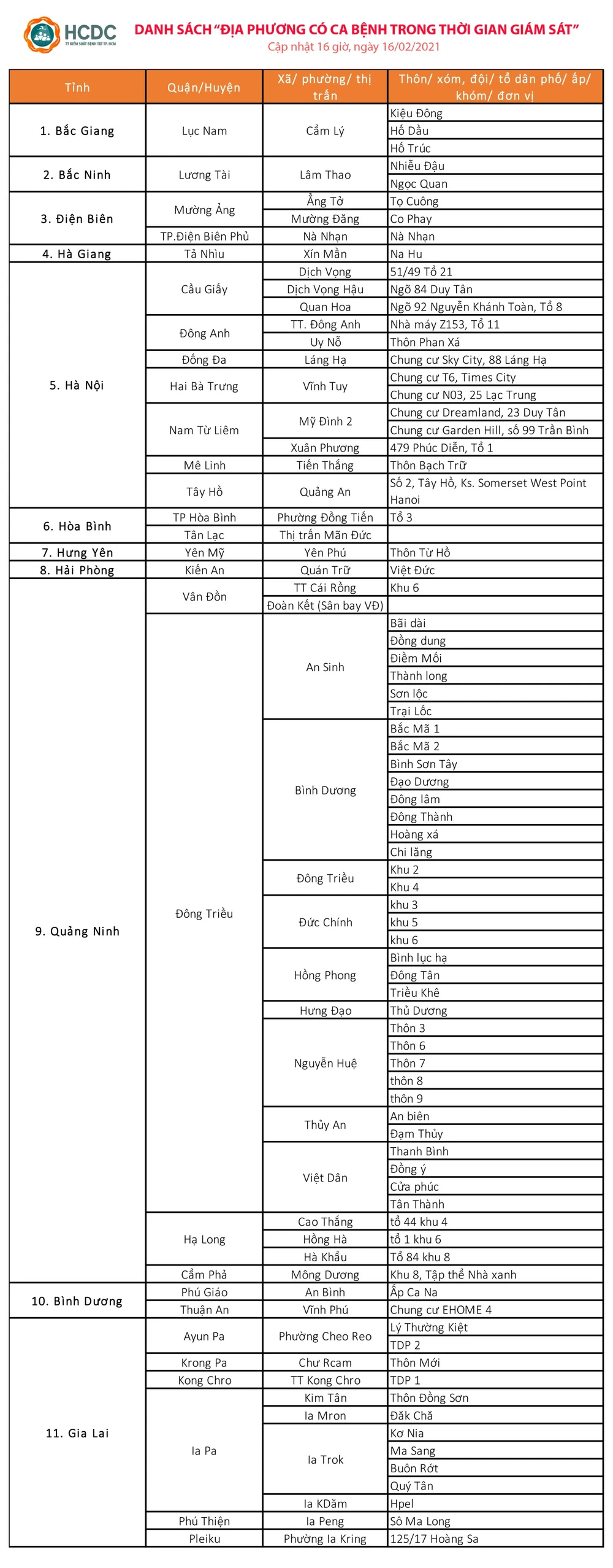 HCDC đưa ra danh sách địa phương có ca bệnh COVID-19 trong thời gian giám sát được cập nhật tới 16 giờ cùng ngày.