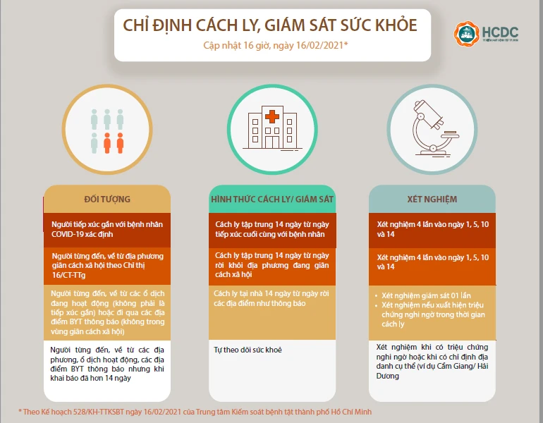 Cạnh đó, HCDC cũng hướng dẫn chỉ định cách ly và xét nghiệm; chỉ định cách ly và giám sát sức khỏe được cập nhật tới 16 giờ cùng ngày. HCDC tiếp tục cập nhật trong thời gian kế tiếp.