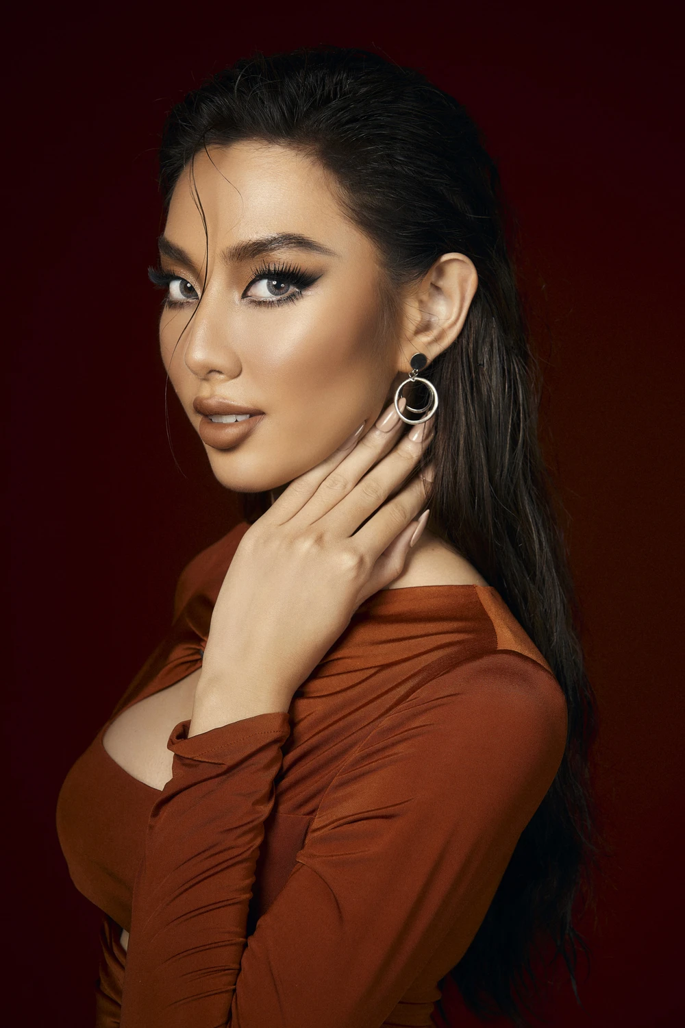 Kết hợp với tone makeup đậm chuẩn sắc beauty queen, cô nàng tràn đầy năng lượng trong từng dáng pose.