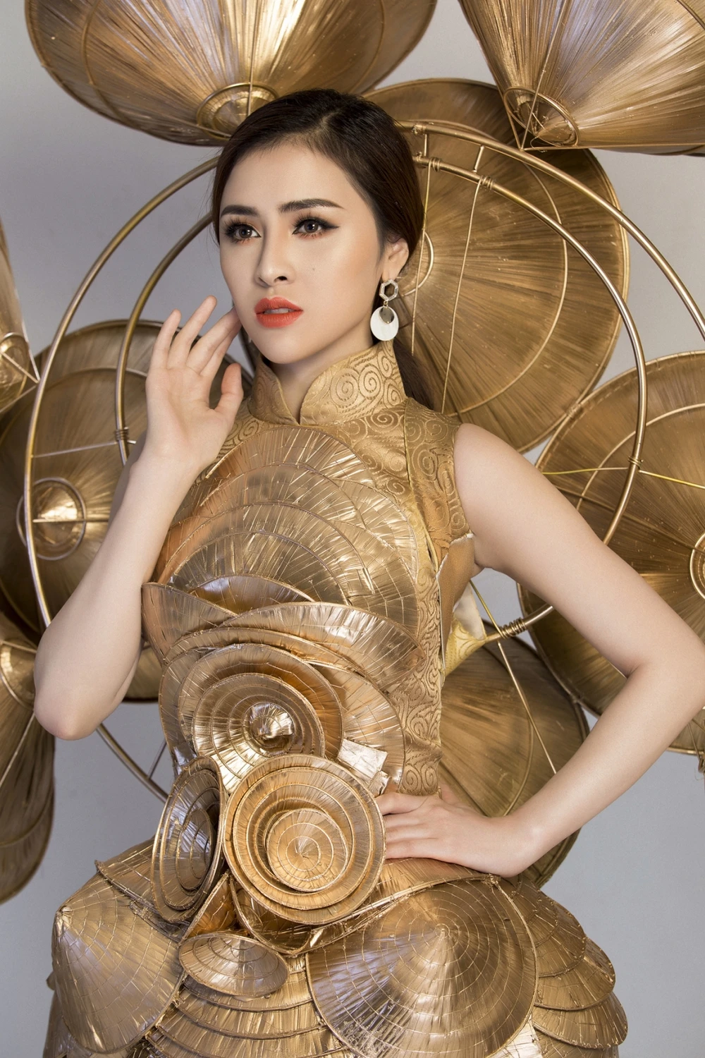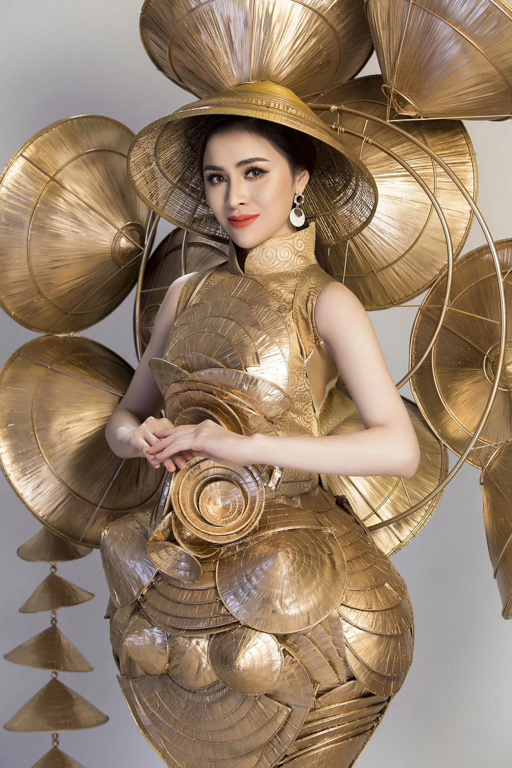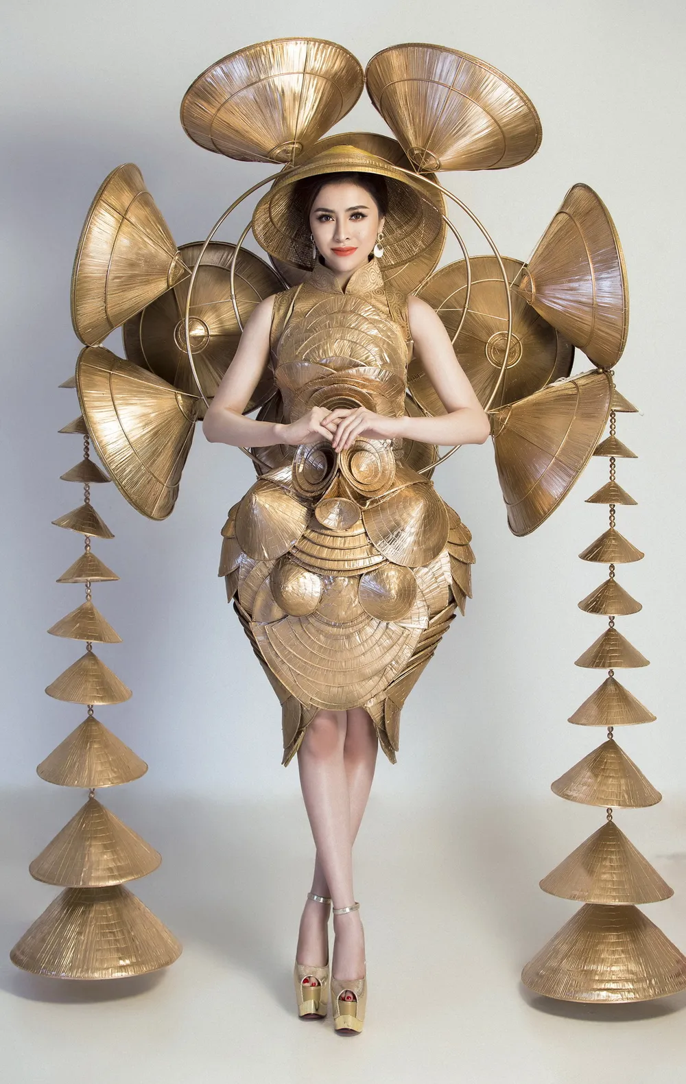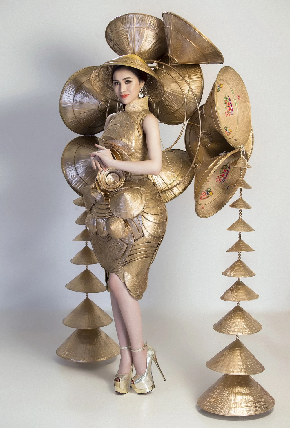 Cụ thể “Nghiêng che Hồn Việt” được tạo nên từ 200 chiếc nón lá lớn nhỏ. Phần nón lá phía sau lưng tỏa rộng như biểu tượng của mặt trời thể hiện cho sự khát khao, chinh phục và sự mạnh mẽ của người phụ nữ Việt Nam.