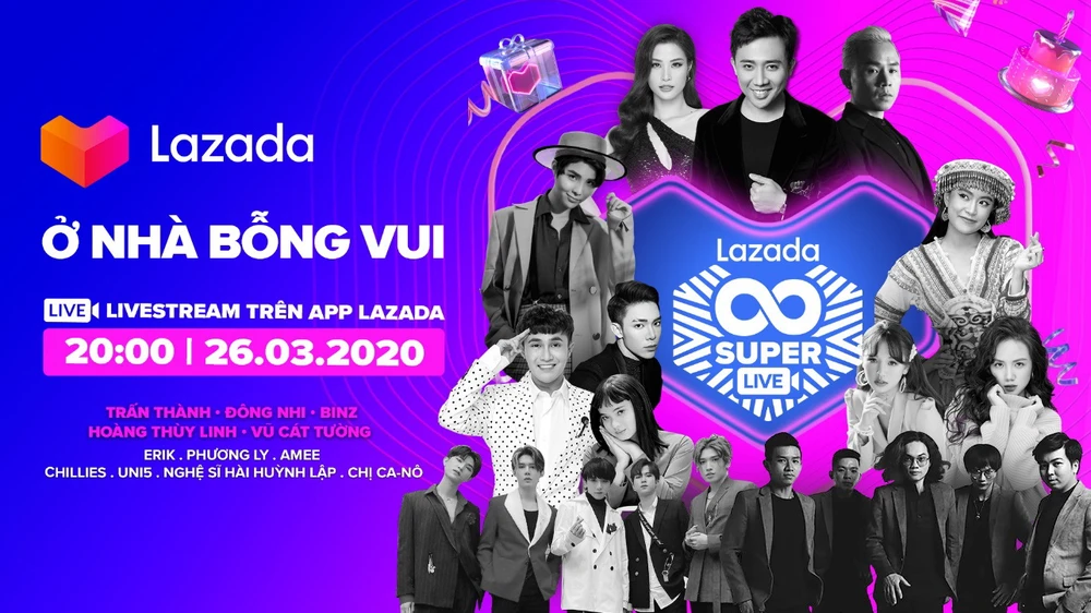 Trong đó, nổi bật nhất là chương trình Lazada Super Live “Ở nhà bỗng vui” với sự góp mặt của những nghệ sĩ hàng đầu như Trấn Thành, Đông Nhi, Binz, Hoàng Thùy Linh, Vũ Cát Tường, Erik, Amee, danh hài Huỳnh Lập, chị Ca Nô…