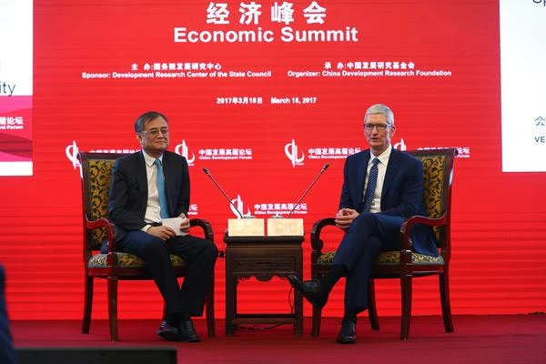 Giám đốc điều hành của Apple, Tim Cook (phải) nói chuyện với Giáo sư Qian Yingyi, trưởng khoa Kinh tế và Quản lý, Đại học Thanh Hoa tại Diễn đàn Phát triển Trung Quốc (CDF) lần thứ 18 tại Bắc Kinh vào ngày 18-3-2017. Ảnh: VCG