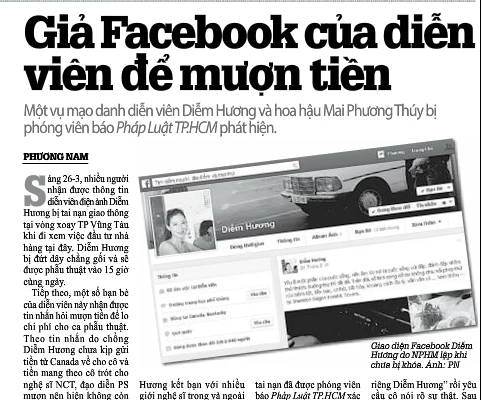 Trong khi đó, trên mạng xã hội Facebook cũng đang xôn xao trước thông tin giả Facebook của Diễm Hương, Mai Phương Thúy để mượn tiền. Theo lời tự thú của M. thì cô đang là sinh viên năm 3 khoa Quản trị kinh doanh ĐH RMIT(quận 7, TP.HCM). Tuy nhiên, qua xác minh của PV Pháp Luật TP.HCM thì ĐH RMIT không có sinh viên nào như trên. Ngoài ra, lần theo những thông tin trước đây một năm thì M. từng lập một Facebook giả kết nối với Facebook của Ngọc Trinh và Vĩnh Thụy để lừa một người ở Hải Phòng mua nội thất ô tô nhưng bất thành. Không giống những hacker chiếm tài khoản của người khác rồi nhắn tin xin card điện thoại, M. đã thực hiện các Facebook giả một thời gian dài và rất rành về nhân thân những người này.Với chiêu tung tin là con riêng của Diễm Hương với nick Trish Nguyên (hoặc Tina), M. đã dựng nên hình ảnh là một cô sinh viên đáng thương để tiếp cận nhiều diễn viên, nghệ sĩ. Được biết có một số nghệ sĩ, người hâm mộ đã cho M. mượn tiền nhưng không muốn tiết lộ.