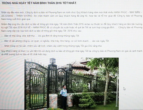 Trang web quảng cáo dịch vụ trông nhà ngày tết của một công ty dịch vụ bảo vệ. Ảnh: NT