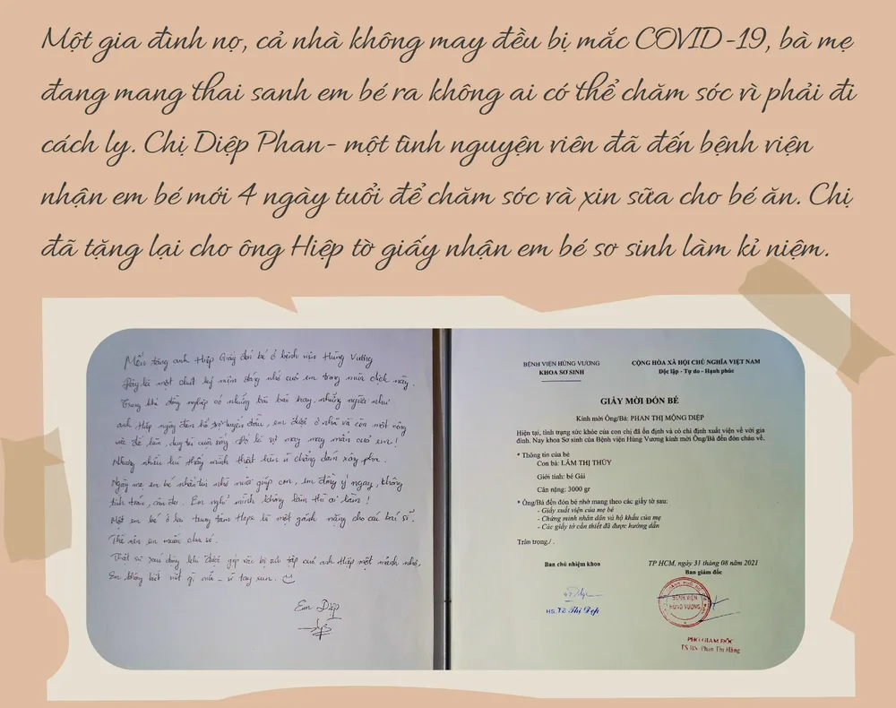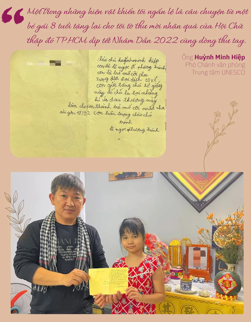 "Một trong những hiện vật khiến tôi ngấn lệ là câu chuyện từ một bé gái 8 tuổi tặng lại cho tôi tờ thư mời nhận quà của Hội Chữ thập đỏ TP.HCM dịp tết Nhâm Dần 2022 cùng dòng thư tay, cháu viết: “Chào chú Huỳnh Minh Hiệp, con là Lê Ngọc Phương Trinh. Con là trẻ mồ côi cha trong đợt đại dịch COVID. Con gửi tặng chú tờ giấy này để chú lưu lại những ký ức đau thương này, làm cho con thành trẻ mồ côi, mất cha. Sài Gòn ngày 18-2, con trân trọng chào chú"– ông Hiệp nghẹn ngào.