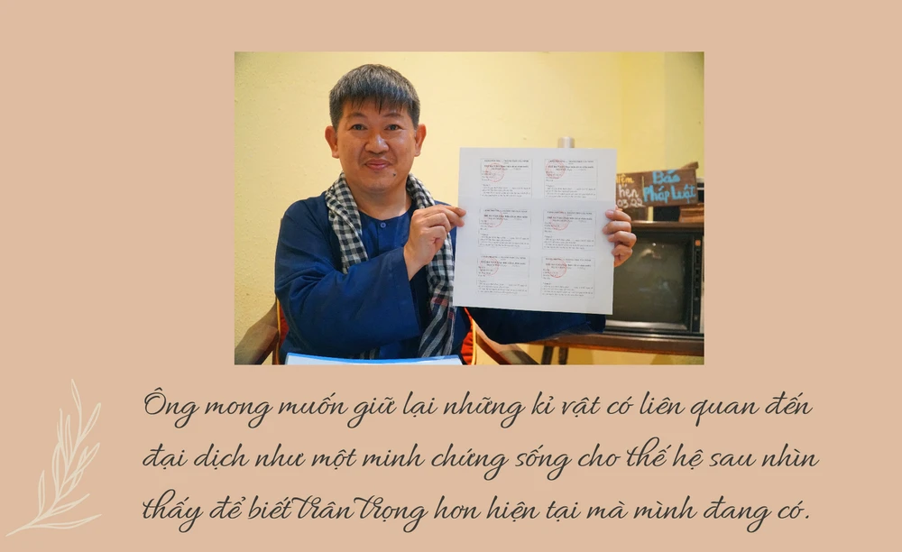Không chỉ riêng ở Sài Gòn, ông Hiệp còn lặn lội khắp các tỉnh thành, gặp ai ông cũng ngỏ ý xin lại phiếu đi chợ, giấy đi đường, giấy phạt, hay bất kỳ những kỉ vật về COVID-19.