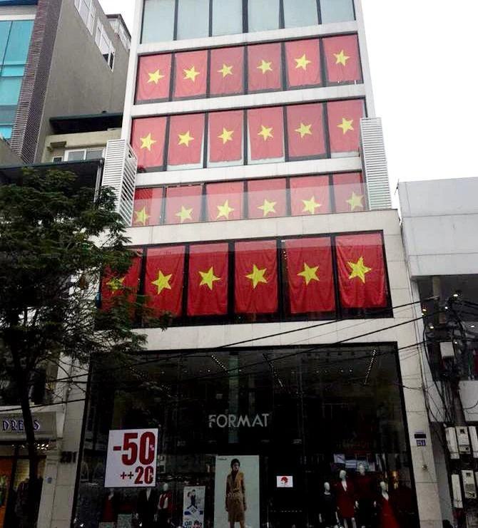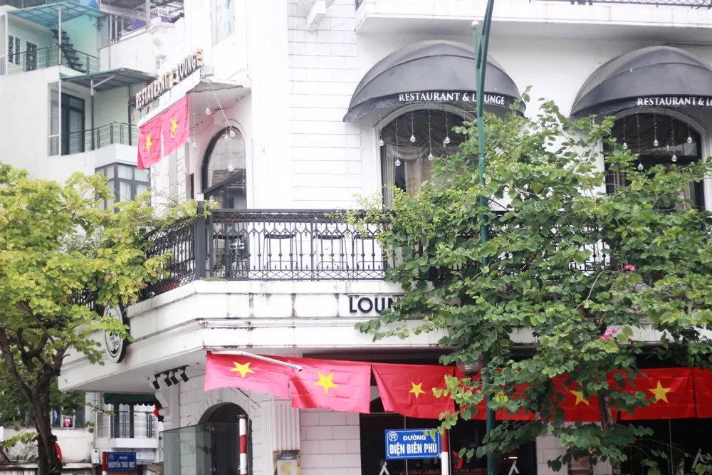 Một số nơi cờ đỏ sao vàng được treo dọc hai bên hông tòa nhà. Ảnh: V.THỊNH