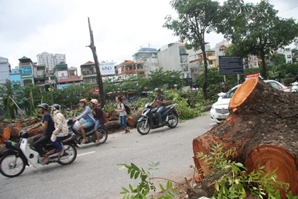 Trên con phố đường Láng gần giao điểm cắt với đường Cầu Giấy có một gốc cây xà cừ lớn khoảng 45-50 tuổi bật gốc do ảnh hưởng của bão. Nhiều đoạn thân cây vẫn vứt ngổn ngang khiến giao thông gặp nhiều khó khăn khi di chuyển qua đây.