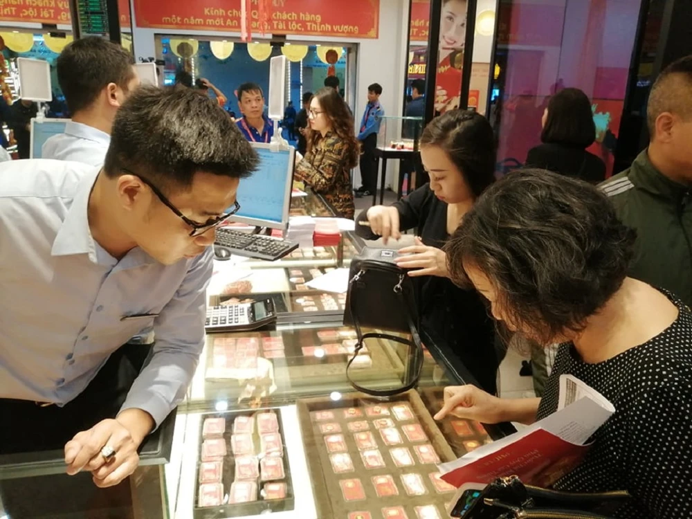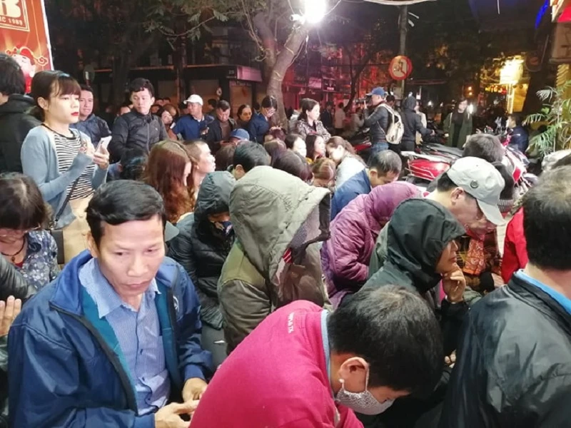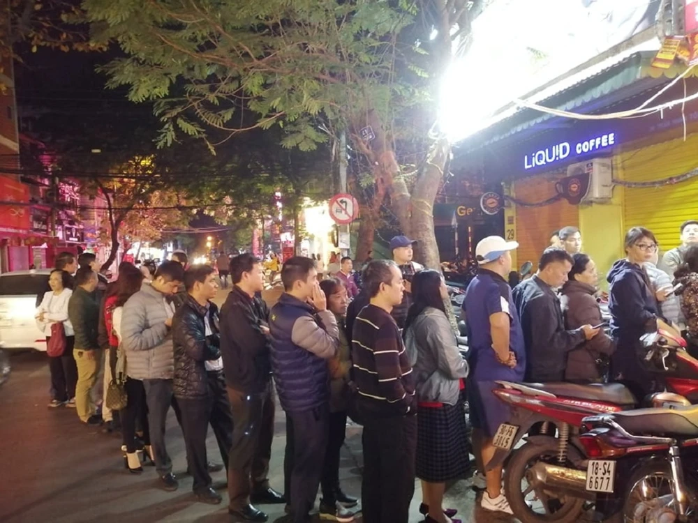 Ngày 14-2, ghi nhận tại hàng loạt cửa hàng vàng trên phố Trần Nhân Tông, Hà Nội, hàng trăm người dân đang nối đuôi xếp hàng trước các cửa tiệm để mua vàng.