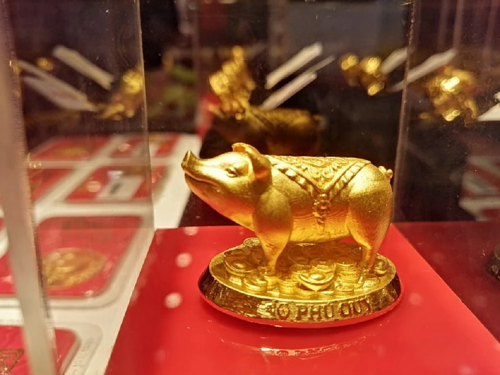 Năm nay, ngoài các loại vàng quen thuộc như thần tài, phú quý, nhẫn tròn trơn, trang sức..., các cửa tiệm đua nhau tung sản phẩm heo vàng để hút khách hàng.