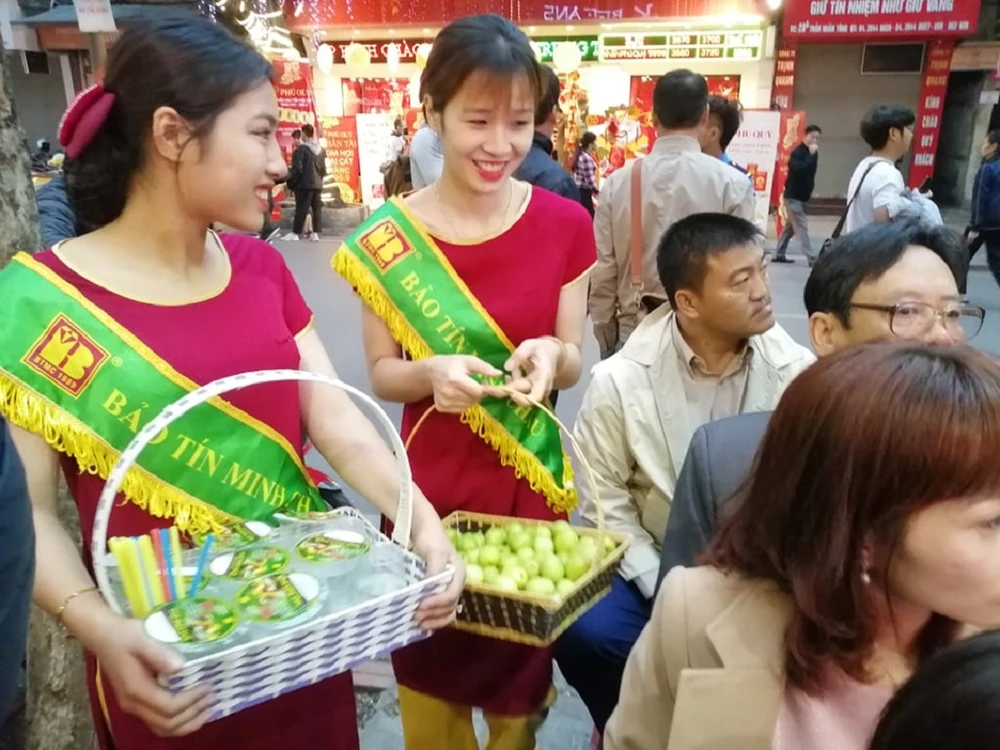 Nhân viên tiệm vàng bố trí hoa quả và nước uống hỗ trợ người đợi mua vàng. Ảnh: TUYẾN PHAN