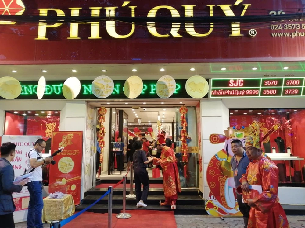 Tương tự, tại cửa hàng Phú Quý, tiệm này trải thảm đỏ để đón khách tới mua vàng ngày Thần Tài. Ngay sau khi mở cửa, hàng chục người dân ngay lập tức ùa vào để mua vàng.