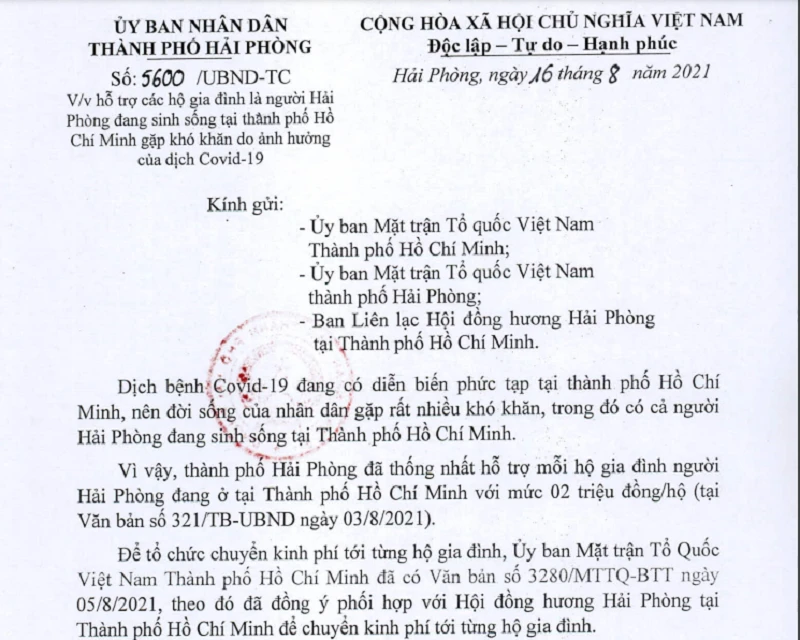 UBND Hải Phòng vừa ban hành văn bản số 5600 về hỗ trợ các hộ gia đình là người Hải Phòng đang sinh sống tại TP.HCM gặp khó khăn do ảnh hưởng của dịch COVID-19.