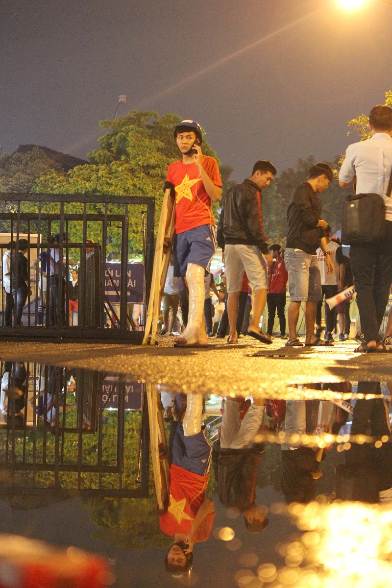 CĐV Huỳnh Thi (quận Tân Bình) dù bị thương ở chân nhưng vẫn một mình đến cổ vũ đội tuyển thi đấu.