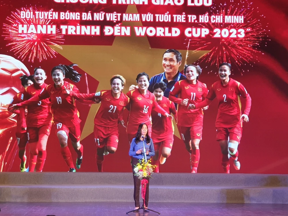 Phát biểu tại buổi giao lưu, bà Phan Thị Thanh Phương - Thành ủy viên, Bí thư Thành đoàn TP.HCM, chia sẻ: "Những ngày đầu xuân, chúng ta được nghe những tin vui từ bóng đá nước nhà. Trong đó, đặc biệt là đội tuyển bóng đá nữ Việt Nam đã đoạt vé dự World Cup 2023 đã mang đến niềm vui, tự hào cho người hâm mộ, trong đó có người hâm mộ TPHCM.
