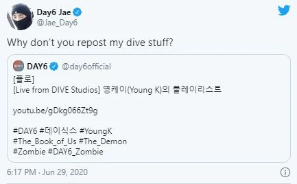 Ngày hôm sau, 30-6, Jae đã đưa ra thêm lời giải thích cho bài đăng của mình, đặt câu hỏi tại sao các hoạt động cá nhân của riêng anh không được chia sẻ trên tài khoản Twitter của nhóm DAY6.