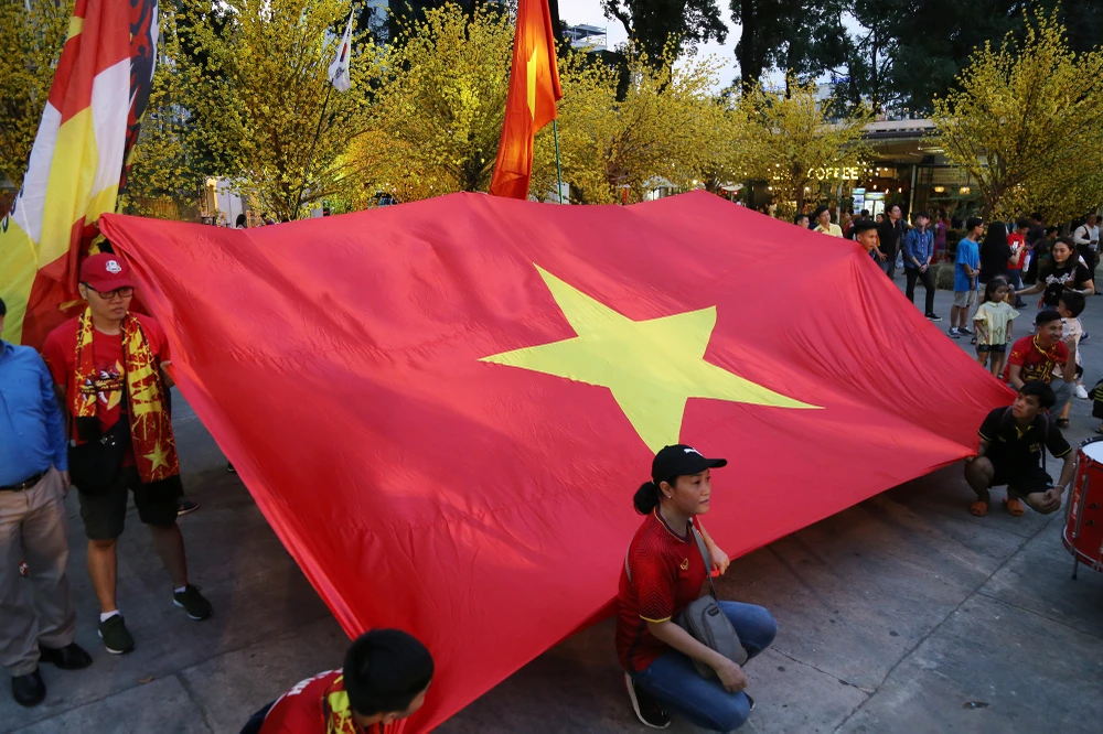Nhóm CĐV mang cờ trống đến hát vang "Việt Nam ơi" cổ vũ đội tuyển.
