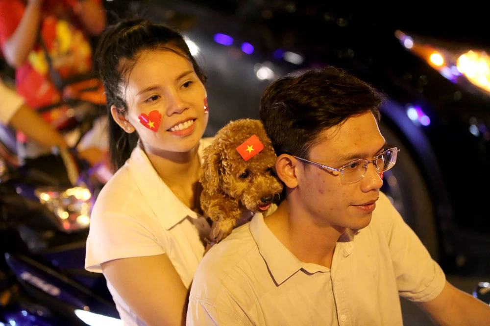 Chú chó được dán quốc kỳ cùng xuống đường ăn mừng.