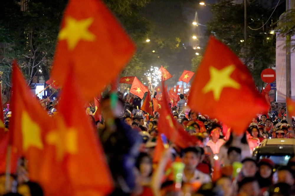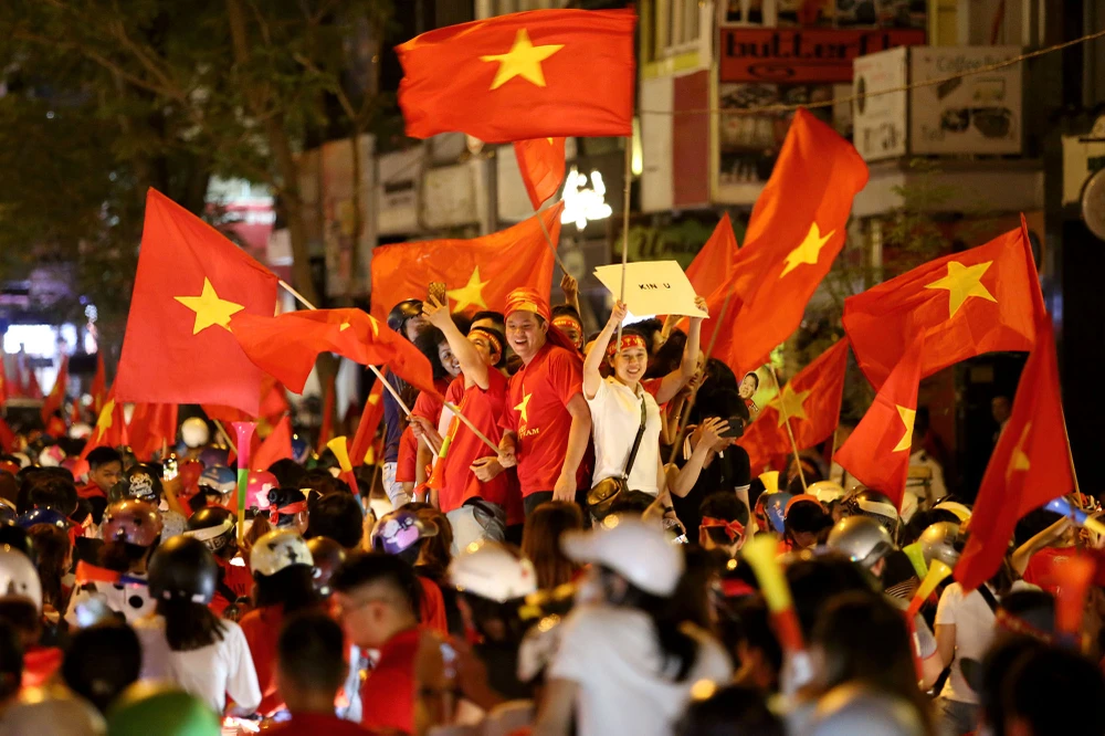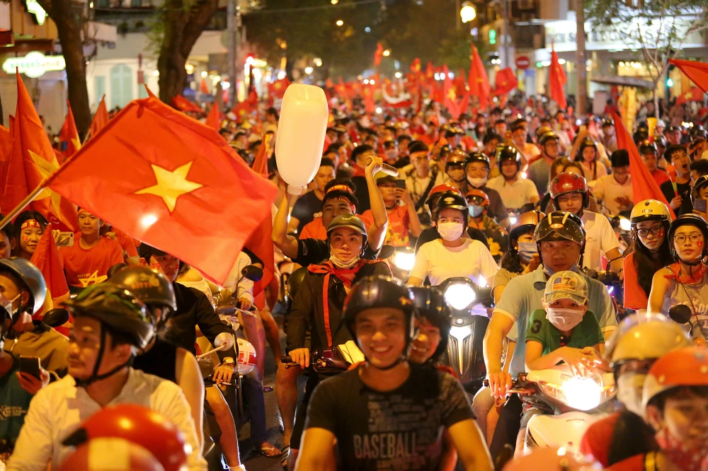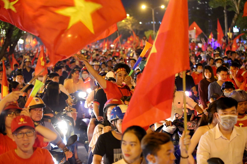 Biển người và cờ, hoa ăn mừng chiến thắng của tuyển Việt Nam trên đường Đồng Khởi, quận 1.