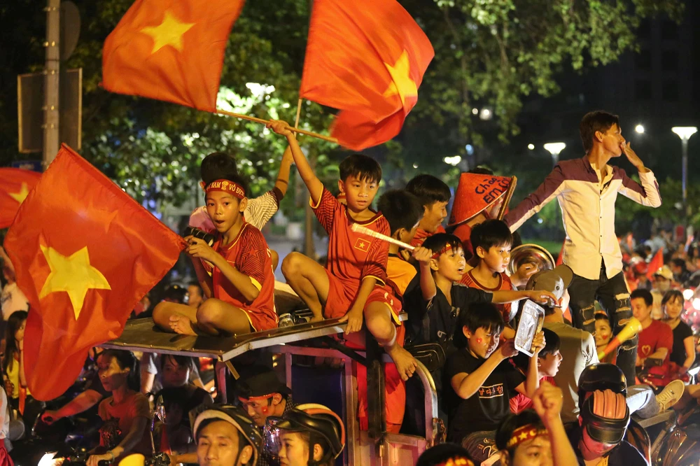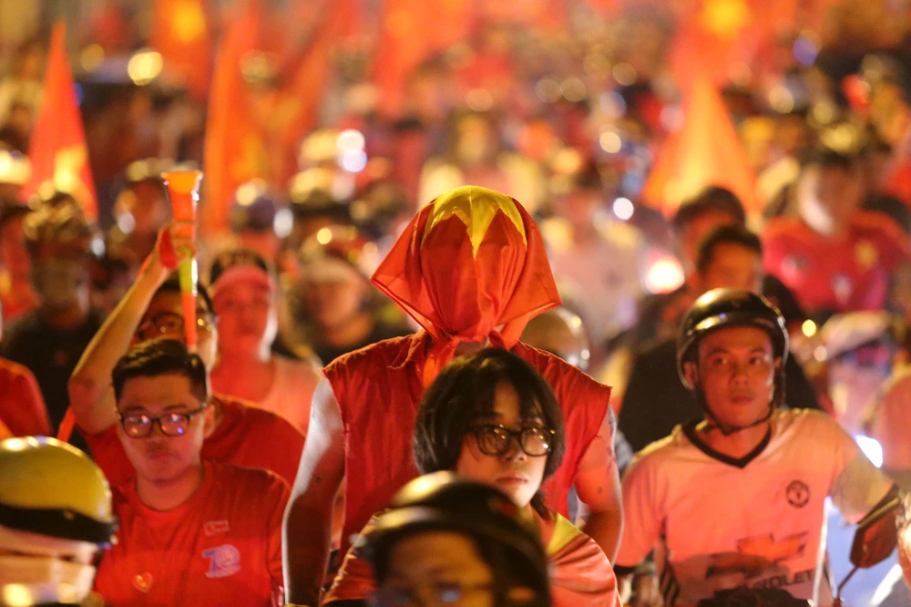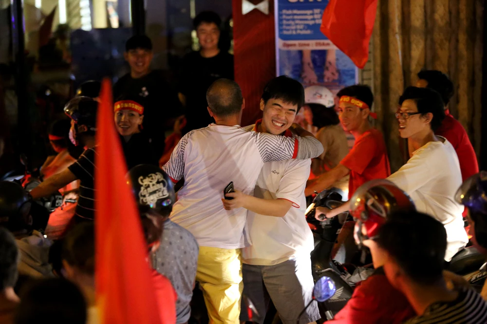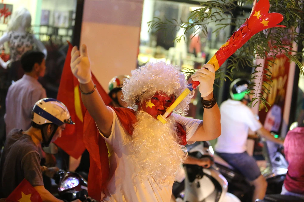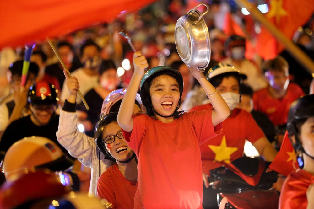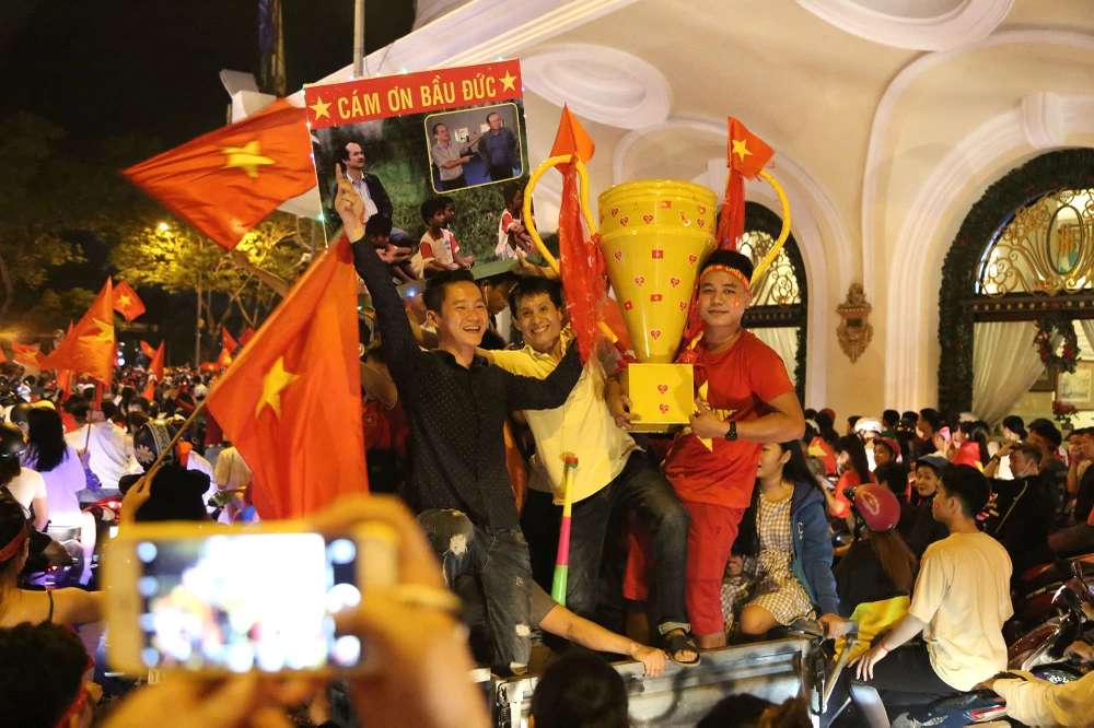 Cổ động viên mang xoong, chảo xuống đường hò reo ăn mừng.
