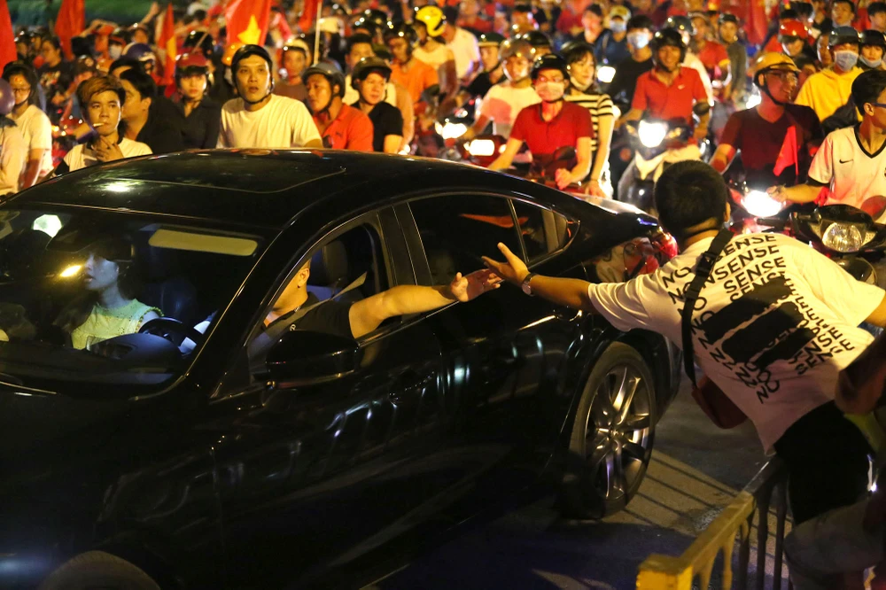 Người hâm mộ đập tay nhau ăn mừng tại góc đường Hàm Nghi - Tôn Đức Thắng.