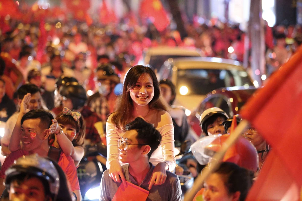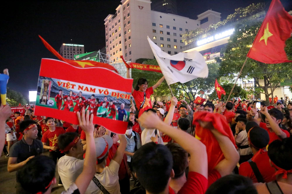 Phố đi bộ Nguyễn Huệ (quận 1, TP.HCM) như vỡ tung sau tiếng còi kết thúc trận đấu. Hàng ngàn người hò reo trong niềm vui chiến thắng.