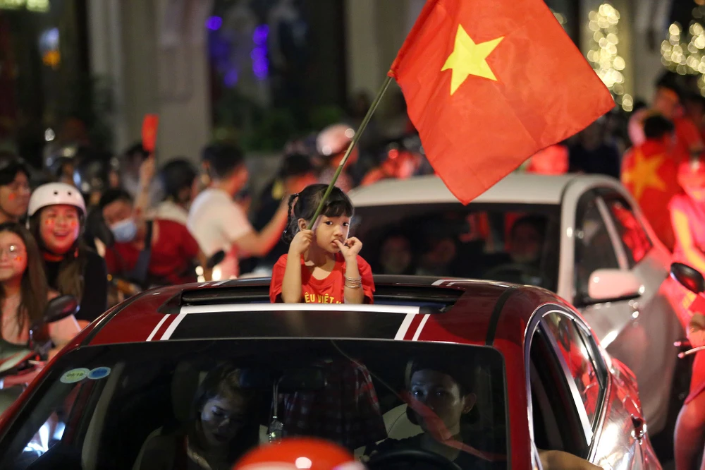 Em nhỏ đứng trên ô tô cầm quốc kỳ hòa theo dòng người đang ăn mừng.