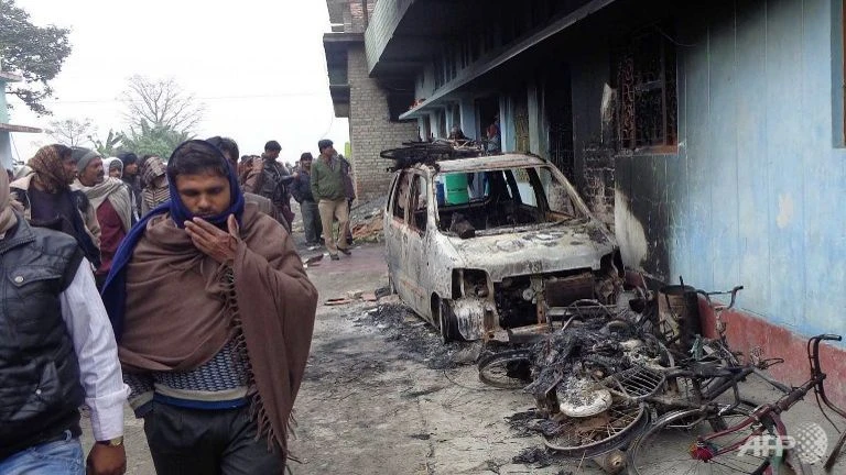 Cảnh sát chống bạo động đang tuần tra ở một khu làng nơi đã xảy ra các vụ bạo lực kéo dài hàng giờ hôm 17-1 ở tiểu bang Bihar. Tình hình căng thẳng vẫn leo thang giữa người Hindu và số ít cộng đồng người Hồi giáo.
