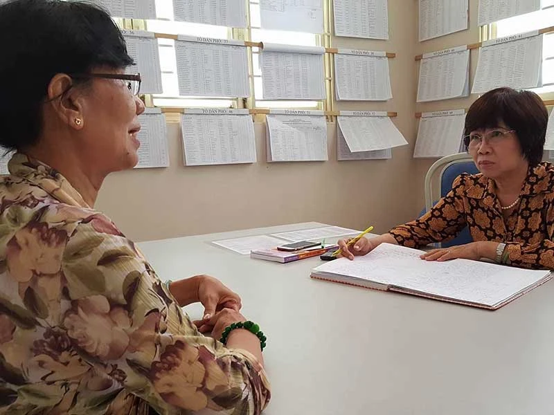 Bà Lợi (phải)tư vấn cho một người dân tại Trung tâm Trợ giúp pháp lý của phường Bến Nghé. Ảnh: HỒNG MINH
