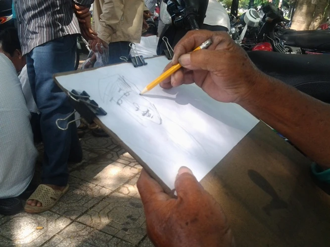 Đồ hành nghề của người họa sĩ già chỉ đơn giản tấm ván kê, bút chì, kẹp giấy, giấy trắng khổ A4 và chiếc ghế để cho khách ngồi.