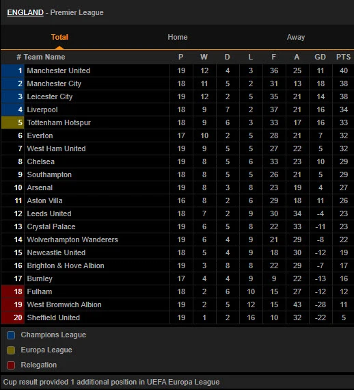 Thắng nhọc Fulham 2-1, Manchester United trở lại ngôi đầu bảng Premier League với tròn 40 điểm. Manchester City đứng thứ hai có 38 điểm nhưng còn 1 trận chưa đấu, Leicester City đứng thứ ba có cùng 38 điểm còn Liverpool xếp thứ 4 có 34 điểm.